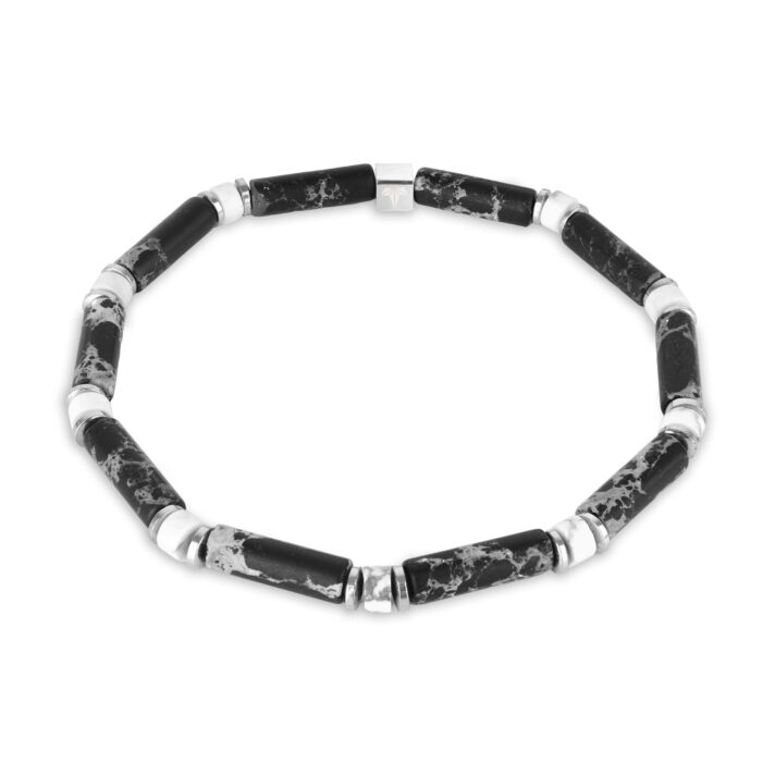 Elegancka bransoletka wykonana z jaspisu cesarskiego, który przyciąga uwagę swoimi unikalnymi wzorami i bogatą paletą barw. Srebrne przekładki z hematytu dodają jej wyrafinowanego blasku, natomiast białe elementy z howlitu wprowadzają subtelny kontrast, podkreślając naturalne piękno kamieni.