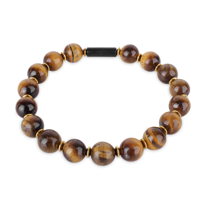 Bransoletka została wykonana z tygrysiego oka, minerału należącego do grupy kwarców. Kamienie w odcieniach złota i brązu tworzą dynamiczną grę kolorów, która dodaje charakteru każdej stylizacji. Dodatkowo, bransoletkę zdobią złote przekładki wykonane z hematytu.